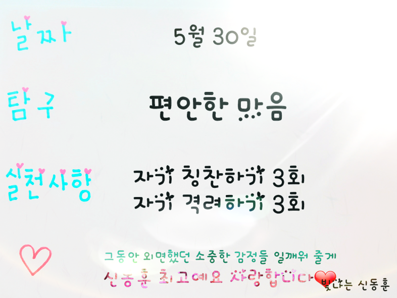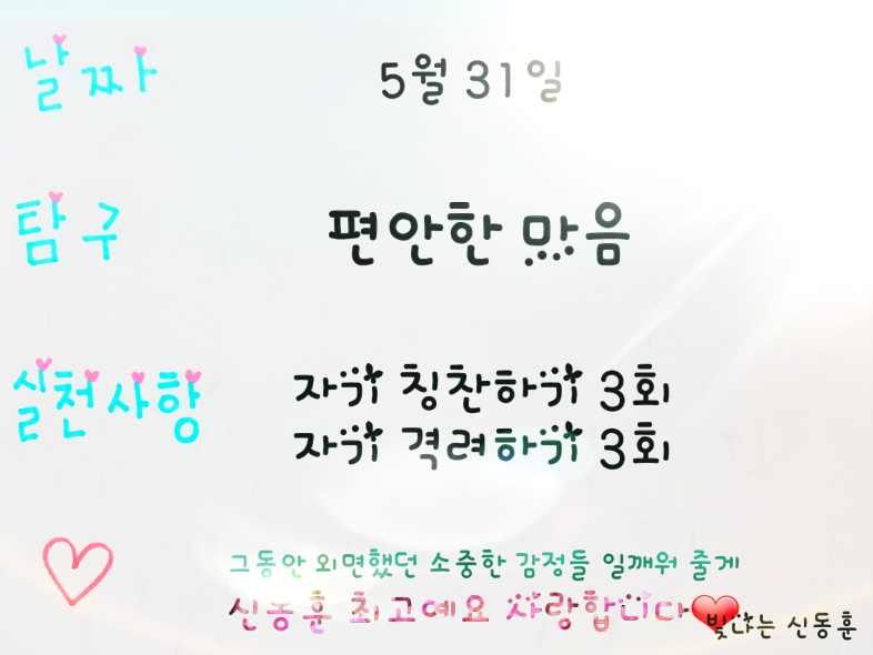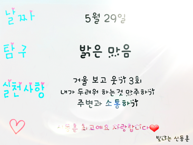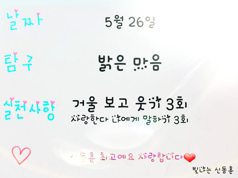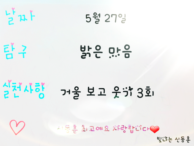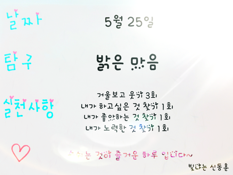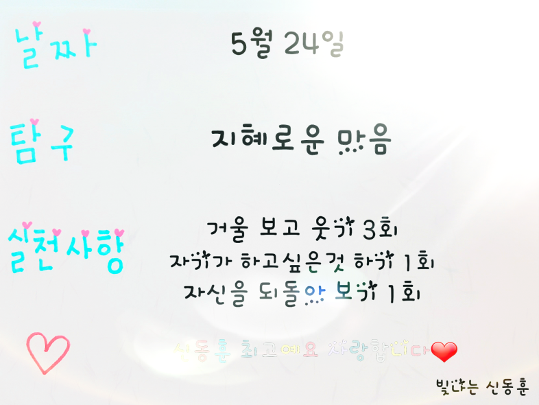 ■밝은 습관 운동가, 빛나는 신동훈님입니다. 신동훈님의 5월 24일부터 5월31일까지의 밝은 습관 가지기를 통한 밝고 맑고 찬란한 여정을 여러분들께 소개합니다.