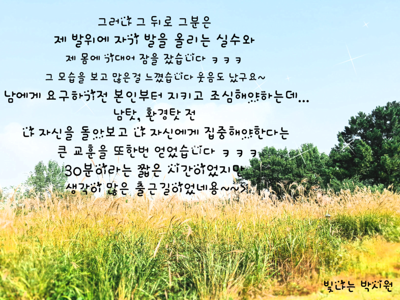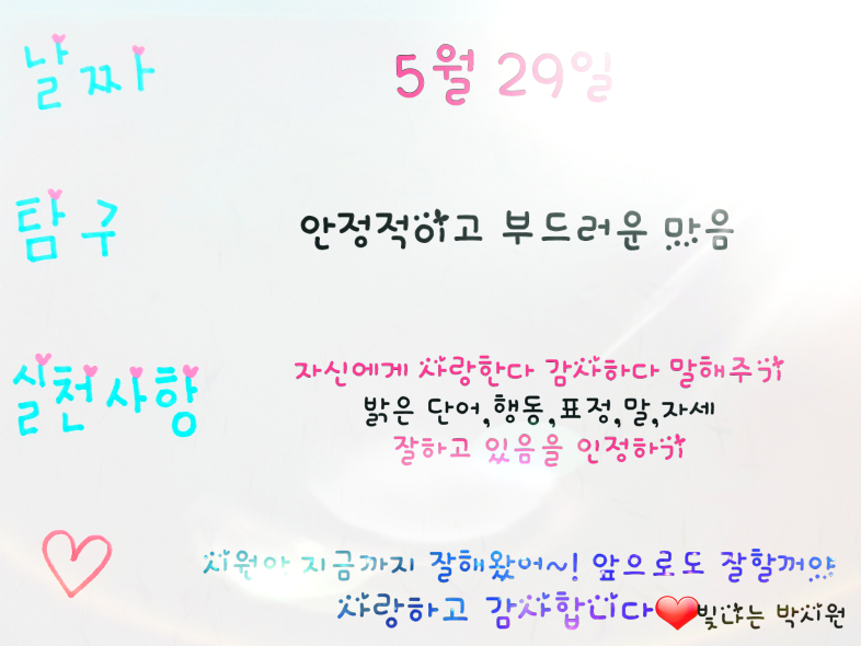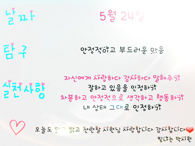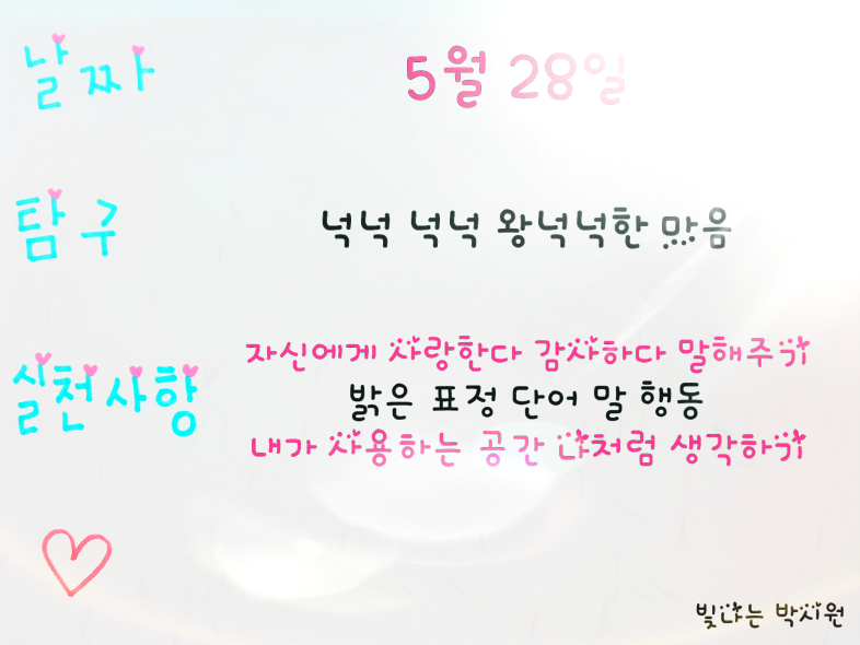■밝은 습관 운동가, 빛나는 박시원님입니다. 박시원님의 5월 24일부터 5월29일까지의 밝은 습관 가지기를 통한 밝고 맑고 찬란한 여정을 여러분들께 소개합니다.