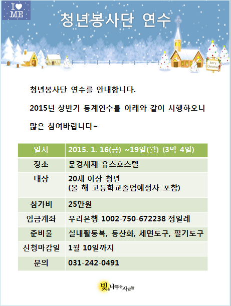 | 91 | 자기봉사 캠프 자원봉사자를 모집합니다. | 평강 | 2015-09-24 | 1744 |