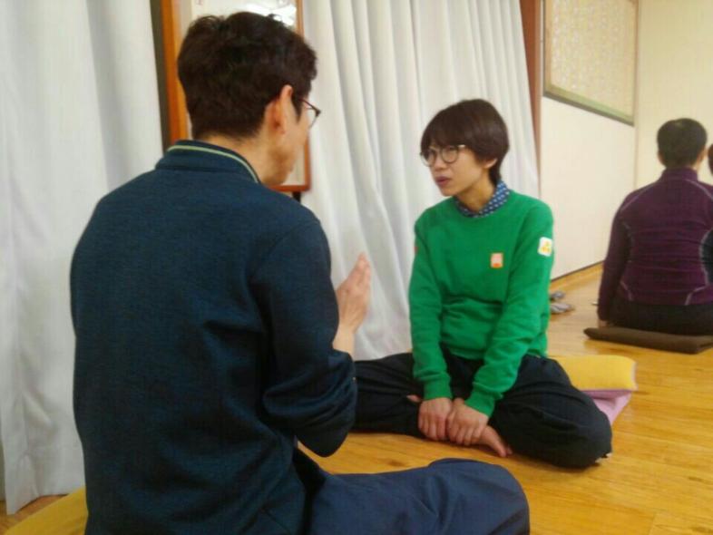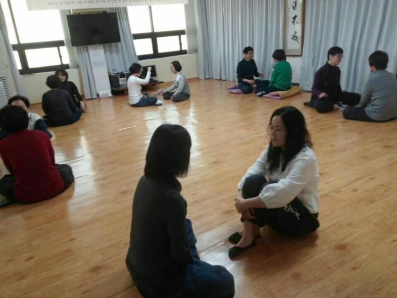 * 진행순서 : 행법, 와식수련 >>> 2인 1조 자기표현하기 >>>5인 1조 자신의 좋은 점 격려하고 칭찬하기, 상대방의 좋은 점 격려하고 칭찬하기 >>> 피드백 및 다음모임 공지