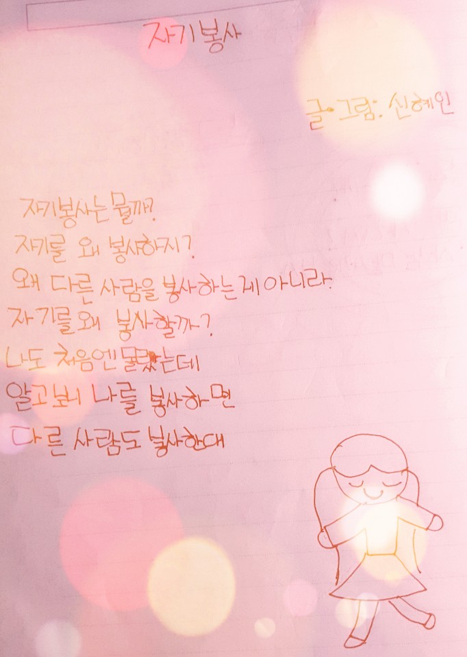 김*선 ; 자신의 이야기 시간에 상대방의 이야기를 들으며 눈물이 났습니다. 힘겨웠던 삶에 대해 측은한 마음의 눈물이었지만 상대를 보며 마치 거울을 보듯 내모습을 보게 되었습니다. 혼자였다면 인식을 못하지만 같이 함께 더불어 하면서 상대를 통해 자신을 더 명확하게 보았습니다.