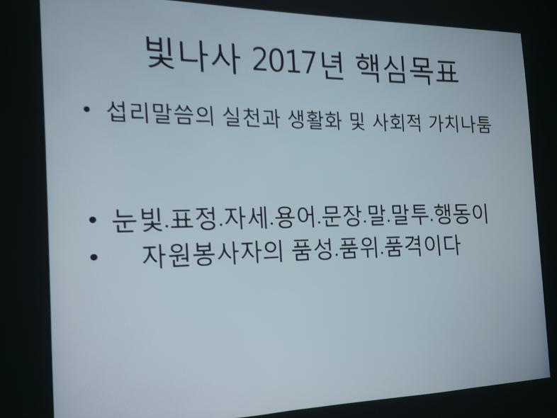 이후에는 빛나사 2017년 핵심목표와 실천운동을 공유하는 시간을 가졌습니다.