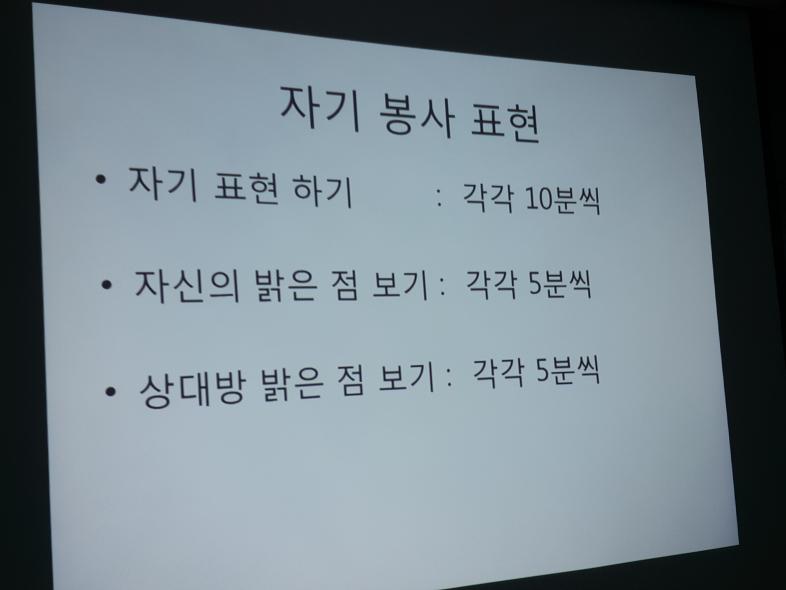 우선 2명이 2인1조가되어 자기표현하기를 시간을 꽉 채워가며 각자 15분씩 하였습니다.