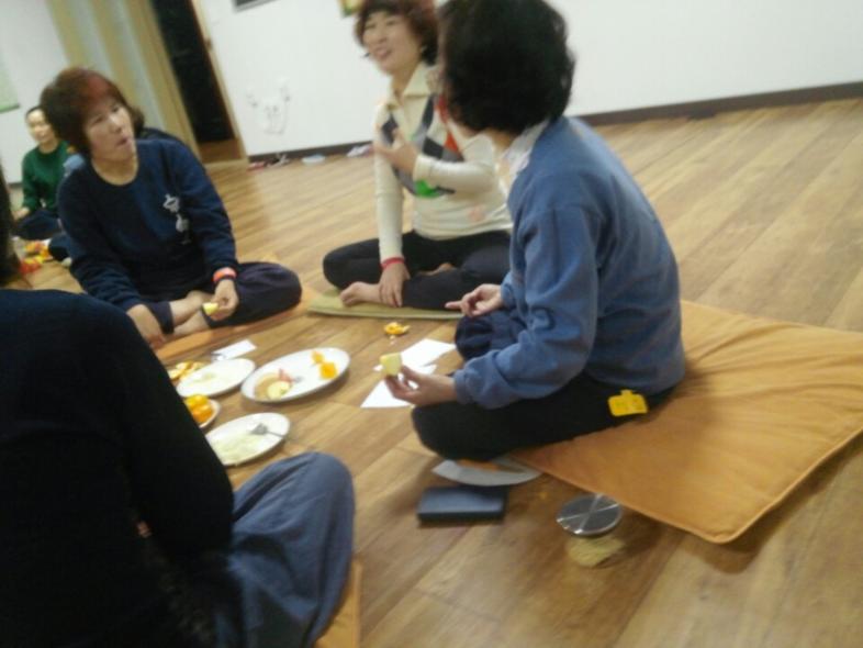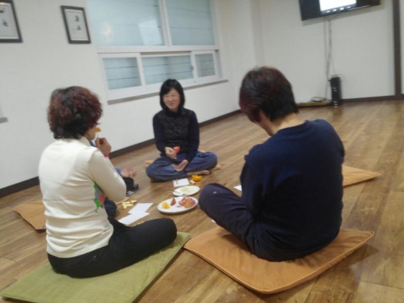차를 마시면서 가벼운 다담으로 시작으로 2시 30분 부터 체조 , 자기봉사 행법(2분), 수련 24분을 하고