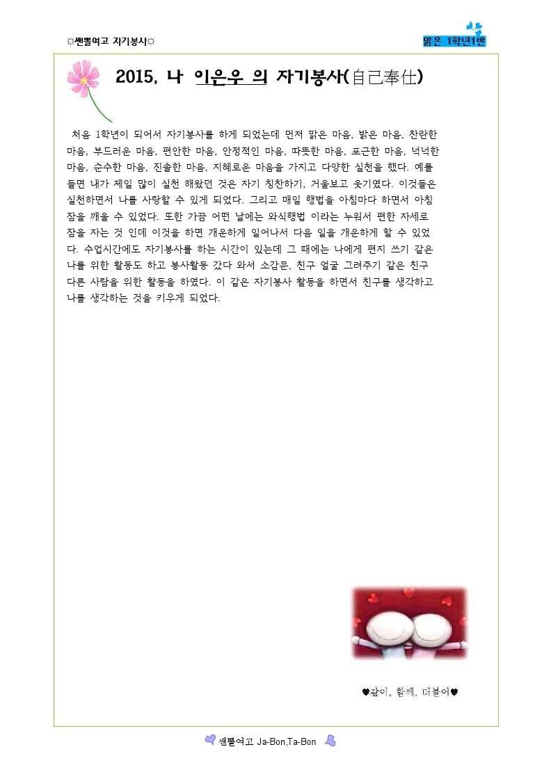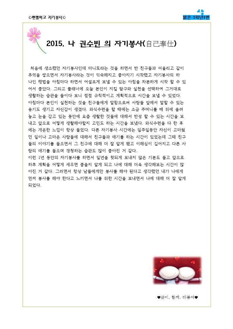 1,2학년 학생들의 자기봉사 실천 사례집을 출판하였습니다.