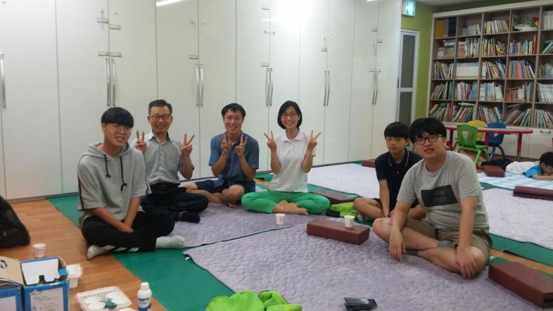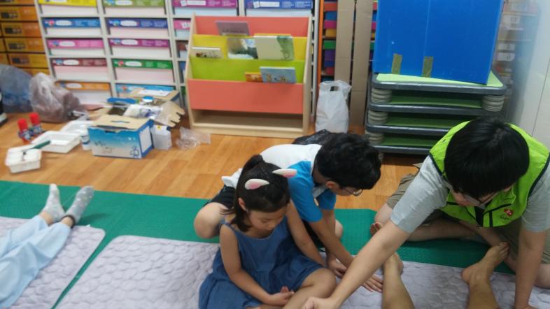 # 봉사 시작 전, 이곳에 봉사하러 온 자원봉사 학생들과 함께 밝은 습관 운동을 하였습니다.