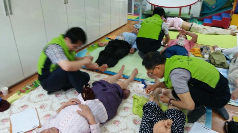 이번 봉사 또한 정기적으로 실시하는 의료봉사활동으로서, '빛나주머니'를 사용하여, 어르신분들의 '단전'(배꼽아래 부분 위치)에 올려놓은 후, 몸을 충분히 이완시키고 어르신들의 등, 무릎, 손, 어깨 등에 침치료와 뜸치료를 실시하였습니다. 또한, '선침패치'를 붙이면 치료효과가 극대화 될 수 있는 장점이 있습니다.