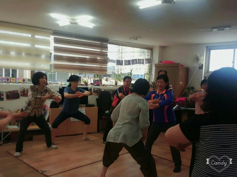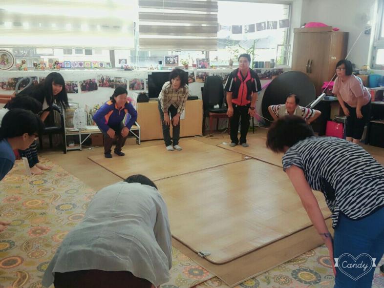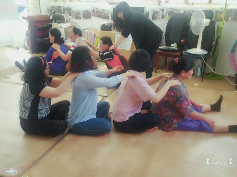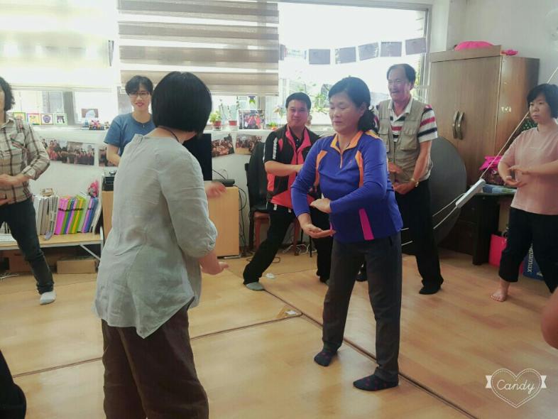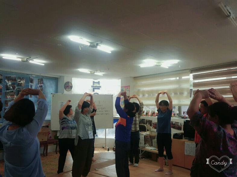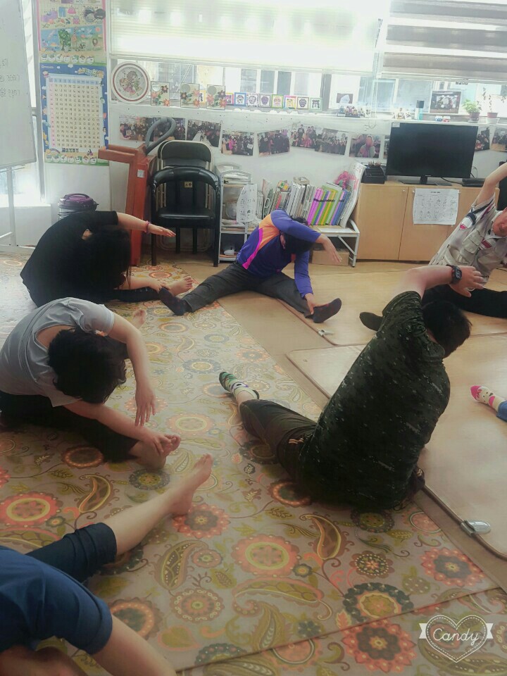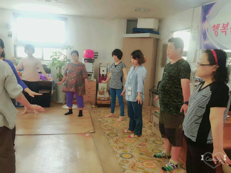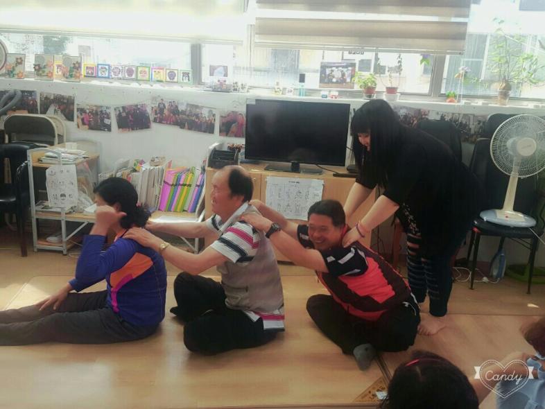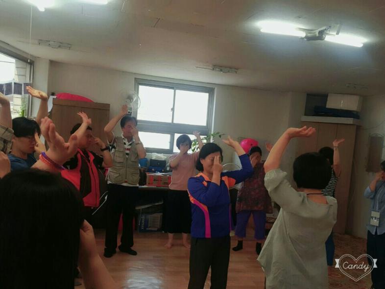 처음 시작은 다소 긴장된 몸을 풀고, 몸의 유연성을 위하여 '체조'를 실시하였습니다. 행복을 주는 사람 참석자들 모두 자원봉사자님들의 진행에 따라 적극적으로 참여해주셨습니다.^^