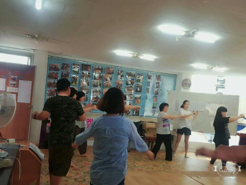 ♦ 자원봉사자님들과 행복을 주는 사람 참석자들께서 같이 함께 '체조'를 하는 모습.