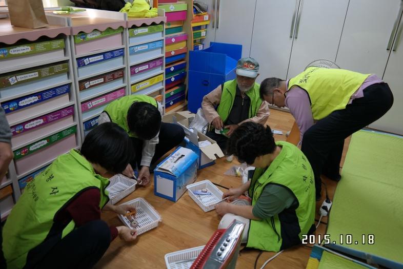 의료봉사를 하기 전, 모여서 물품 준비를 하고 있습니다.