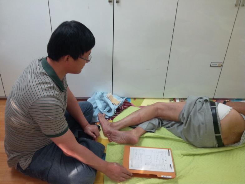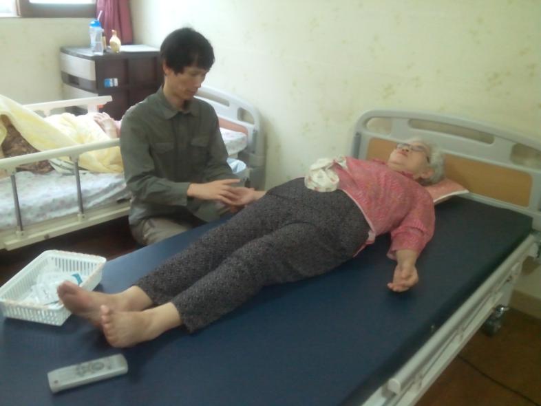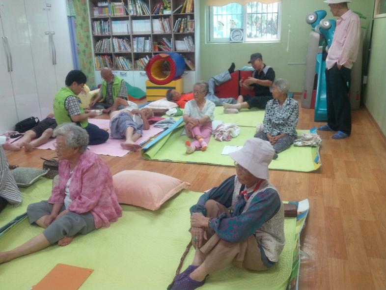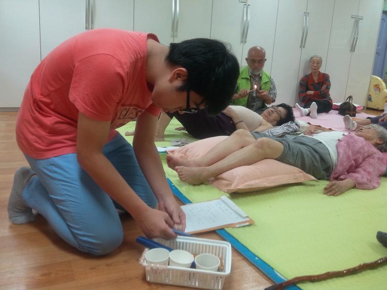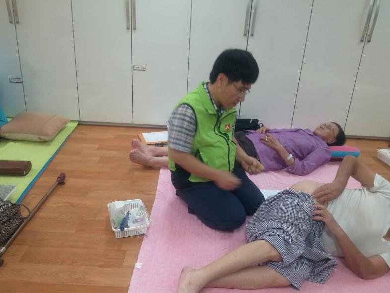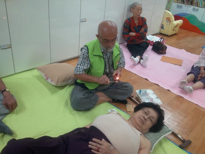 한방의료 봉사, 소금주머니올려놓는 자기봉사, 공간의 빛을 밝게 해주는 호흡봉사