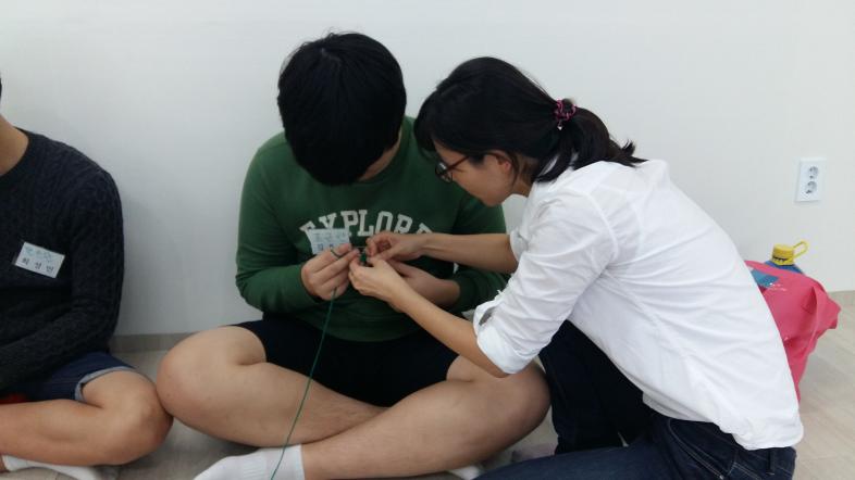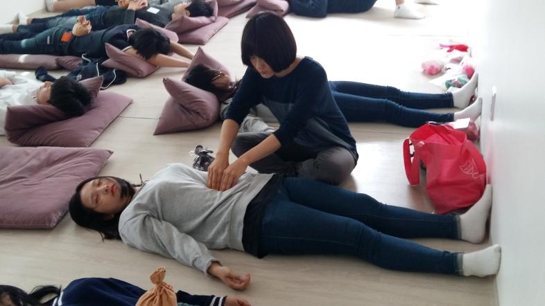 자원봉사 선생님께서 정성스런 손길로 긴장을 풀어주면서 좀 더 편안한 이완을 유도하고 계시는군요~~