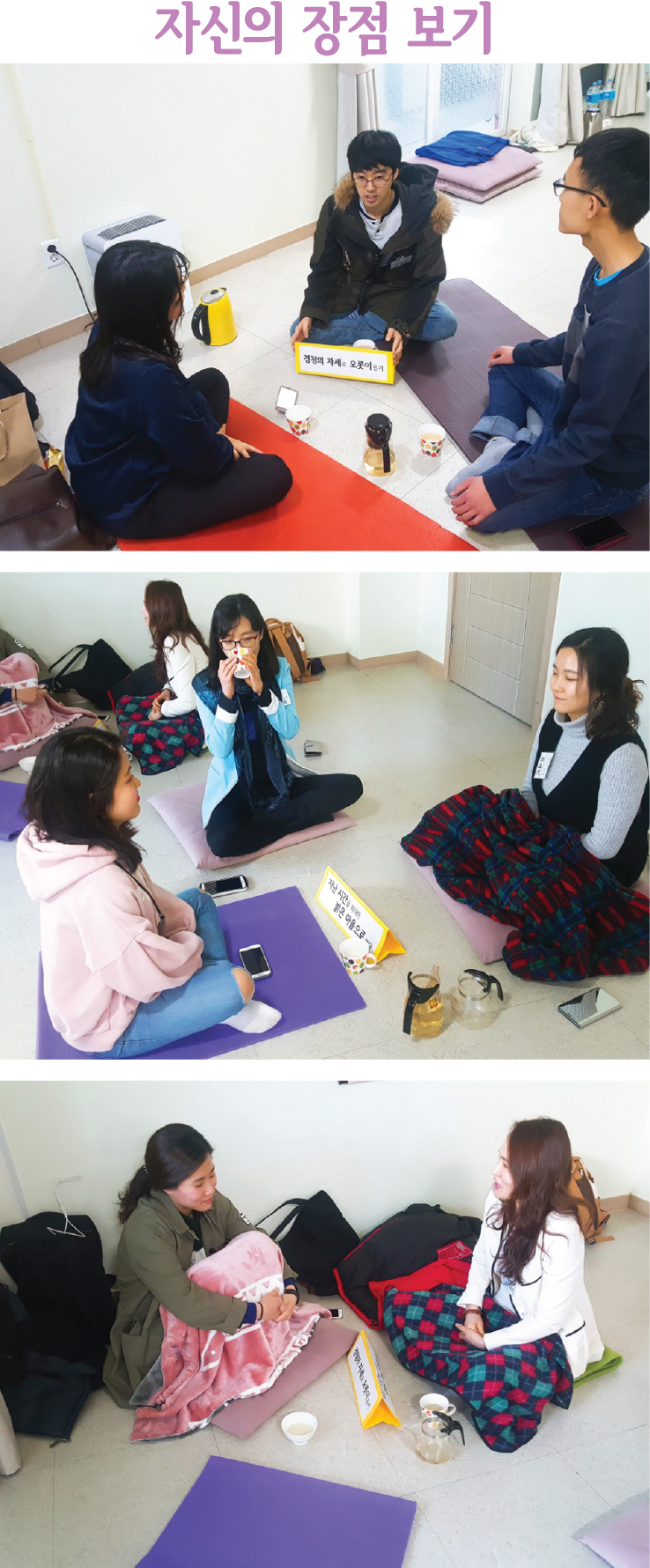다음은 3인1조로 자신의 장점을 보며 각각 5분동안 프로그램을 진행하였습니다.