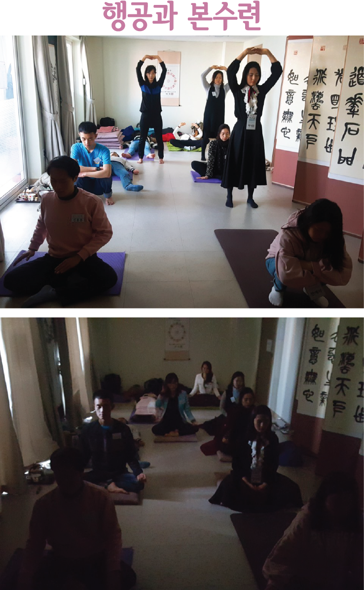 간단한 체조, 행공, 본수련을 통해 자신의 몸과 마음을 정화, 순화, 승화하였고