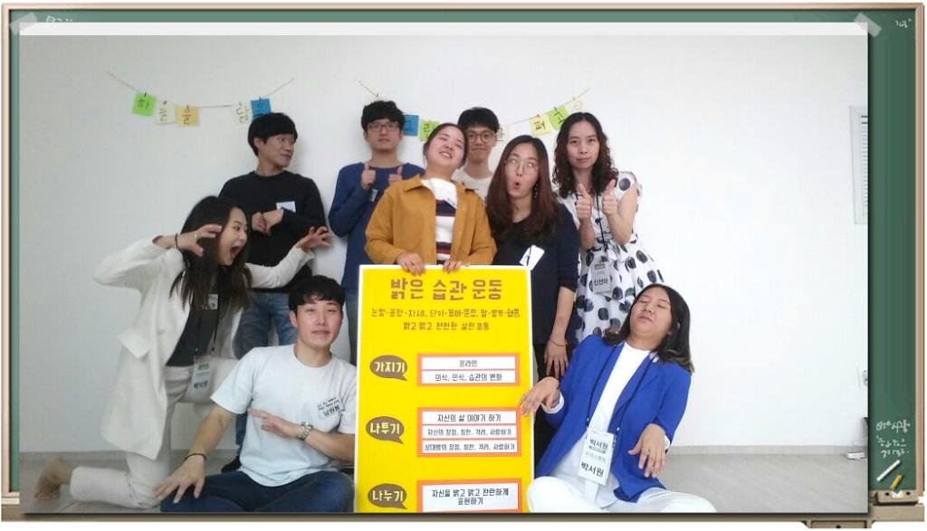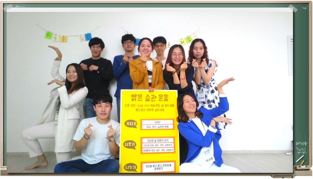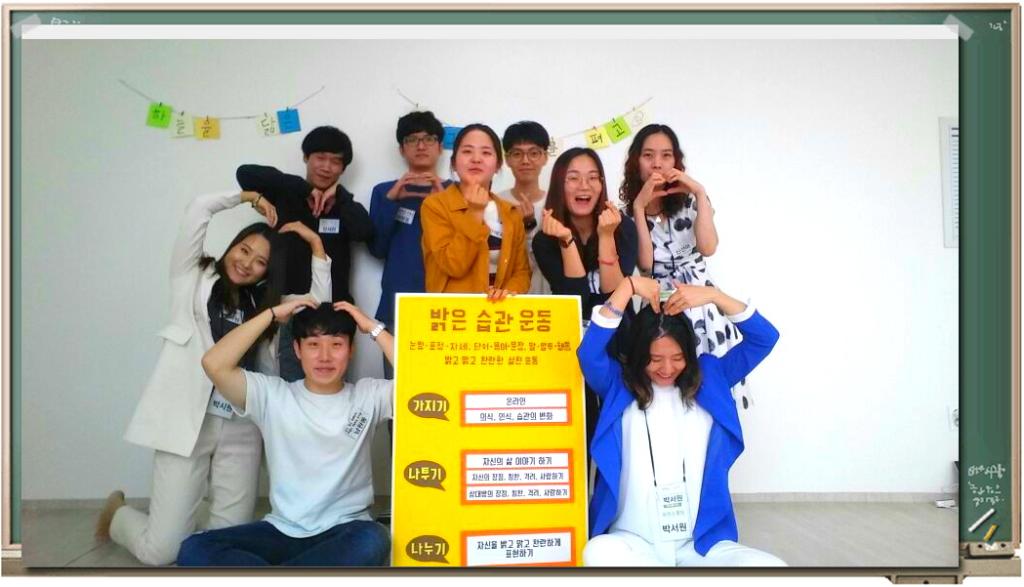 지난 상반기동안 갈고 닦은 밝은습관나투기의 흐름을 이어 밝은습관 나누기를 통해 나의 눈빛, 표정, 자세, 단어, 용어, 문장, 말, 말투, 행동이 밝고 맑고 찬란해 질수 있는 시간을 가졌습니다.