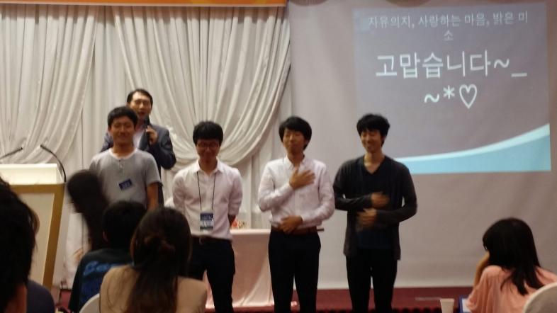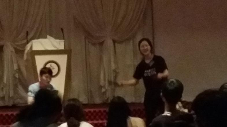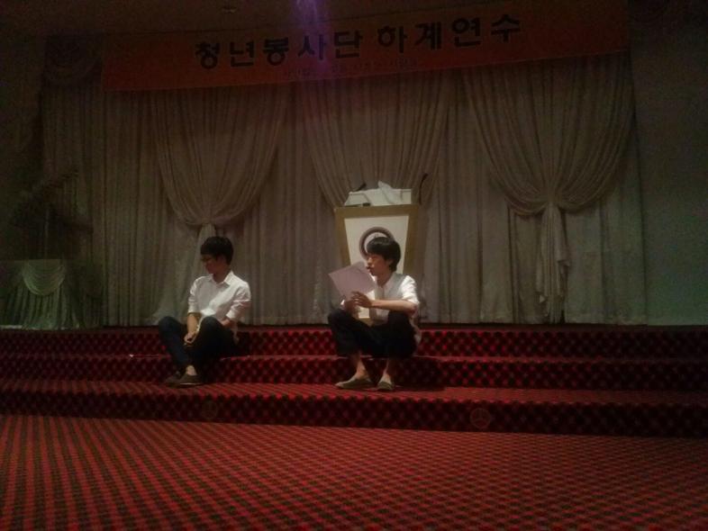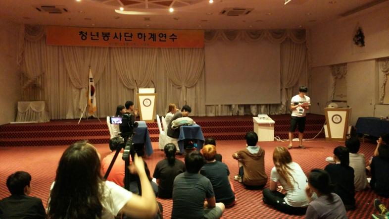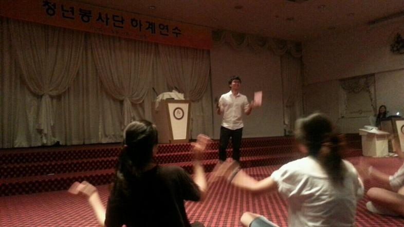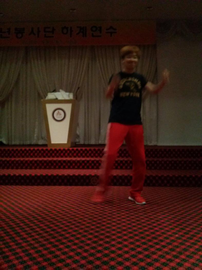 레크레이션 시간에도 플래시몹처럼 앉아서 보기만 했지만, 하는 것처럼 재미있었다. 몸짓으로 단어 맞추기 팀플레이 때는 구멍(?)들을 보면서 빵빵 터지기도 하고.... 특히 장기자랑 시간은 역대 연수중에서 최고였다!! 참여도도 가장 높았고, 대담하고 솔직했다.ㅋㅋㅋ 세 남자의 삼각관계는 정말 최고였다. 그리고 승표 강사님의 새로운 모습과 재능들을 발견했다. 분홍색 꽃무늬 앞치마와 먼지털이가 너무나 잘 어울렸고, 레크레이션 게임 때 진행 때에도 귀여운 사과머리를 하고 (단장님 말한 대로) ‘날 것 그대로’의 모습이 게임 진행을 더 즐겁게 만들어주었다.